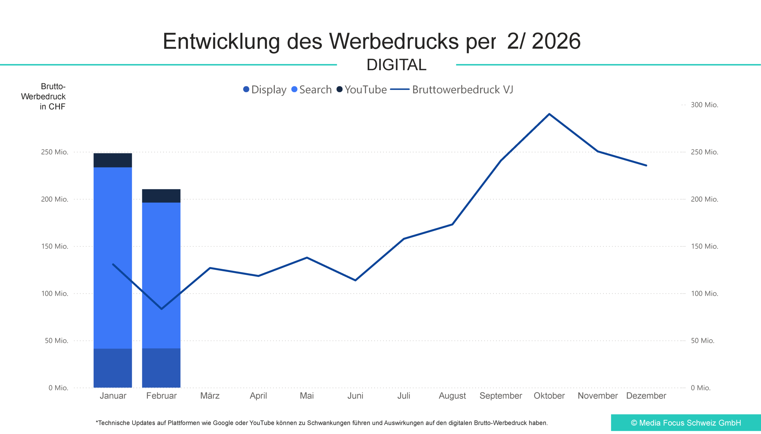 Zur besseren Vergleichbarkeit mit dem Vorjahr werden der klassische Werbemarkt und die digitalen Kanäle (Search, YouTube, Display) separat ausgewiesen. Schwankungen in der Online-Erfassung können durch externe Einflüsse – insbesondere durch technische Updates seitens grosser Plattformen wie Google oder YouTube – verstärkt werden. Dies betrifft insbesondere den Bereich Search, in dem es regelmässig zu Änderungen kommt, die die Vergleichbarkeit des Brutto-Werbedrucks mit dem Vorjahr beeinträchtigen können.