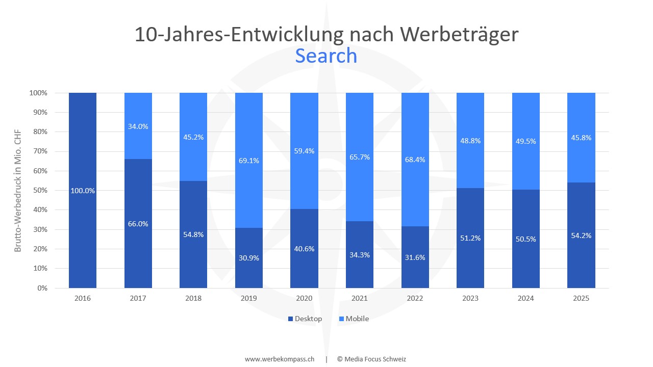 Die Grafik zur Search-Werbung präsentiert den Brutto-Werbedruck der letzten 10 Jahre aufgeteilt in die Kategorien deutsche Schweiz und französische Schweiz. Zusätzlich werden die Zu- oder Abnahmen des Brutto-Werbedrucks im Vergleich zum Vorjahr aufgezeigt.