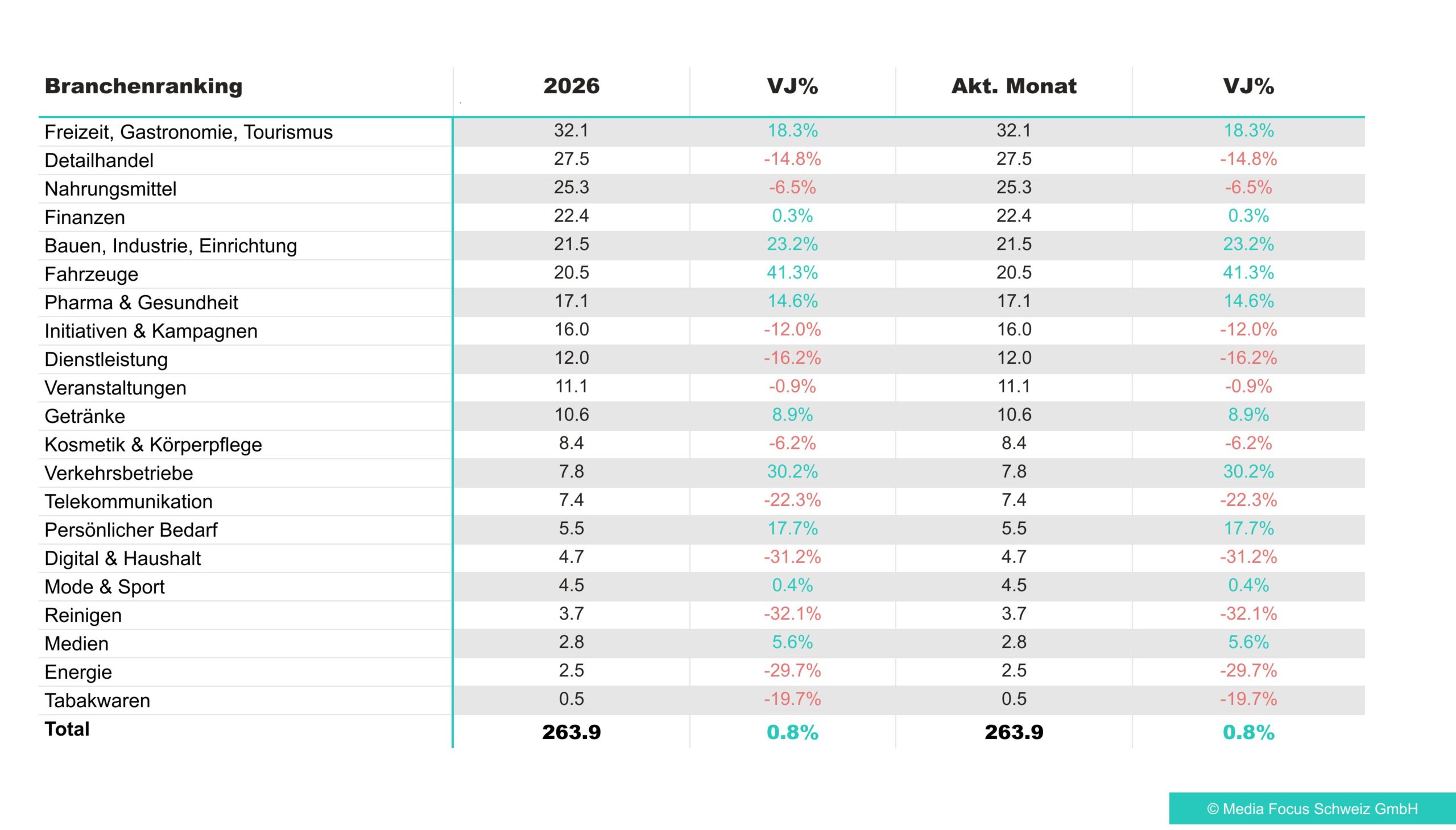 Zehn der 21 Branchen starteten positiv ins neue Jahr. Die deutlichste prozentuale Steigerung unter den grossen Branchen verzeichnet Fahrzeuge (+41.3%) – getragen durch eine erhöhte Werbeaktivität rund um die Produkte Polestar 5 Elektro Limousine, Suzuki E-Vitara SUV Elektro und Nissan Micra Leasing. Ebenfalls stark präsentieren sich die Verkehrsbetriebe (+30.2%), Bauen, Industrie, Einrichtung (+23.2%) sowie Freizeit, Gastronomie, Tourismus (+18.3%); bei Bauen, Industrie, Einrichtung trägt insbesondere IKEA zur positiven Entwicklung bei.