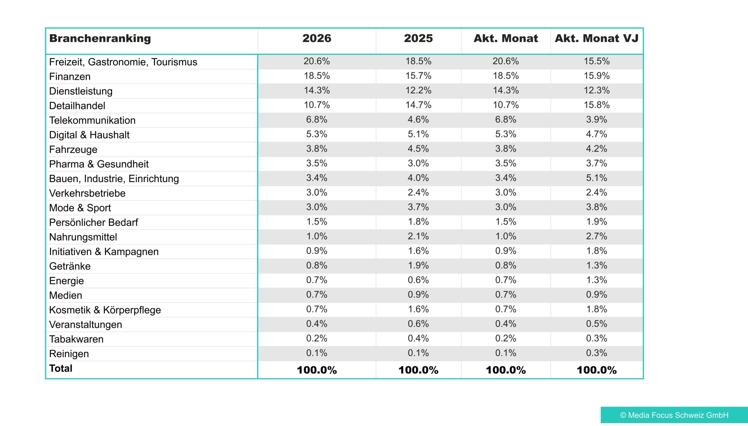 Freizeit, Gastronomie, Tourismus übernimmt im Januar zudem die Spitzenposition im Branchenranking, unter anderem gestützt durch die verstärkte Kommunikation für Swiss International Air Lines und Emirates sowie einer höheren Präsenz von McDonald’s Restaurants.
