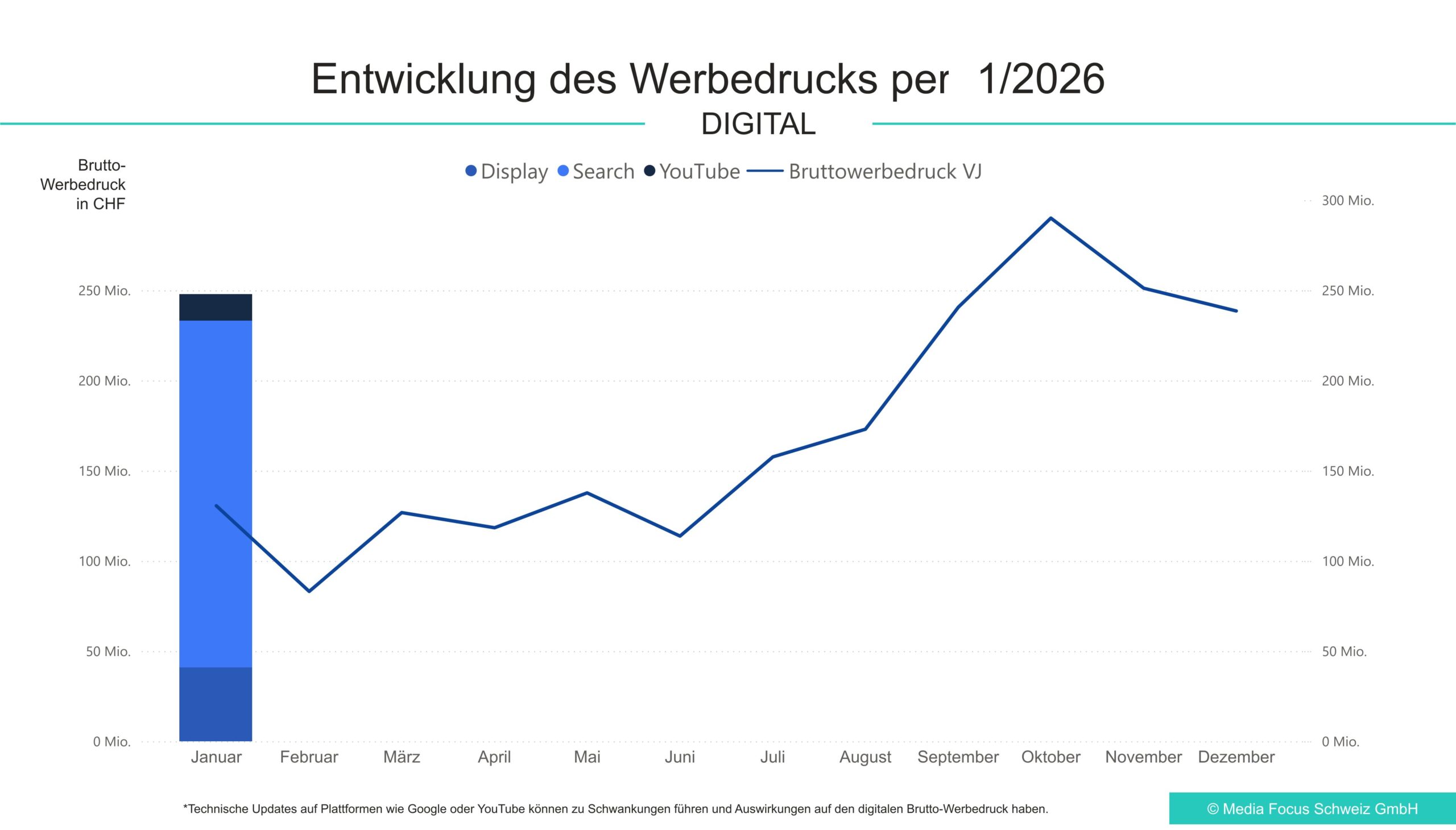 Zur besseren Vergleichbarkeit mit dem Vorjahr werden der klassische Werbemarkt und die digitalen Kanäle (Search, YouTube, Display) separat ausgewiesen. Schwankungen in der Online-Erfassung können durch externe Einflüsse – insbesondere durch technische Updates seitens grosser Plattformen wie Google oder YouTube – verstärkt werden. Dies betrifft insbesondere den Bereich Search, in dem es regelmässig zu Änderungen kommt, die die Vergleichbarkeit des Brutto-Werbedrucks mit dem Vorjahr beeinträchtigen können.