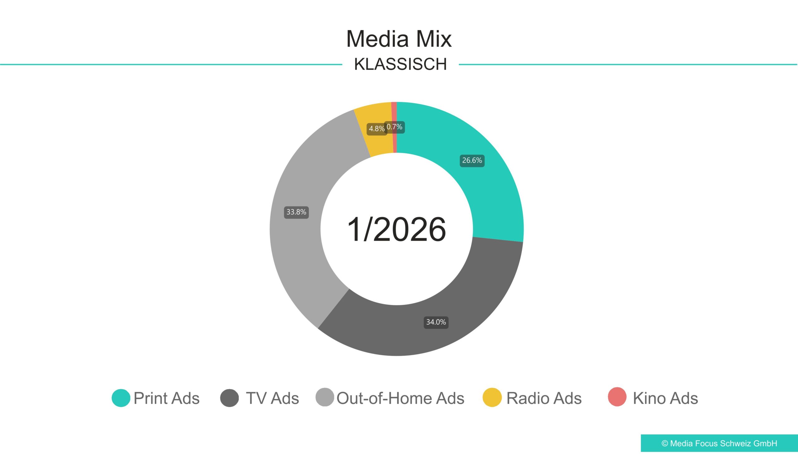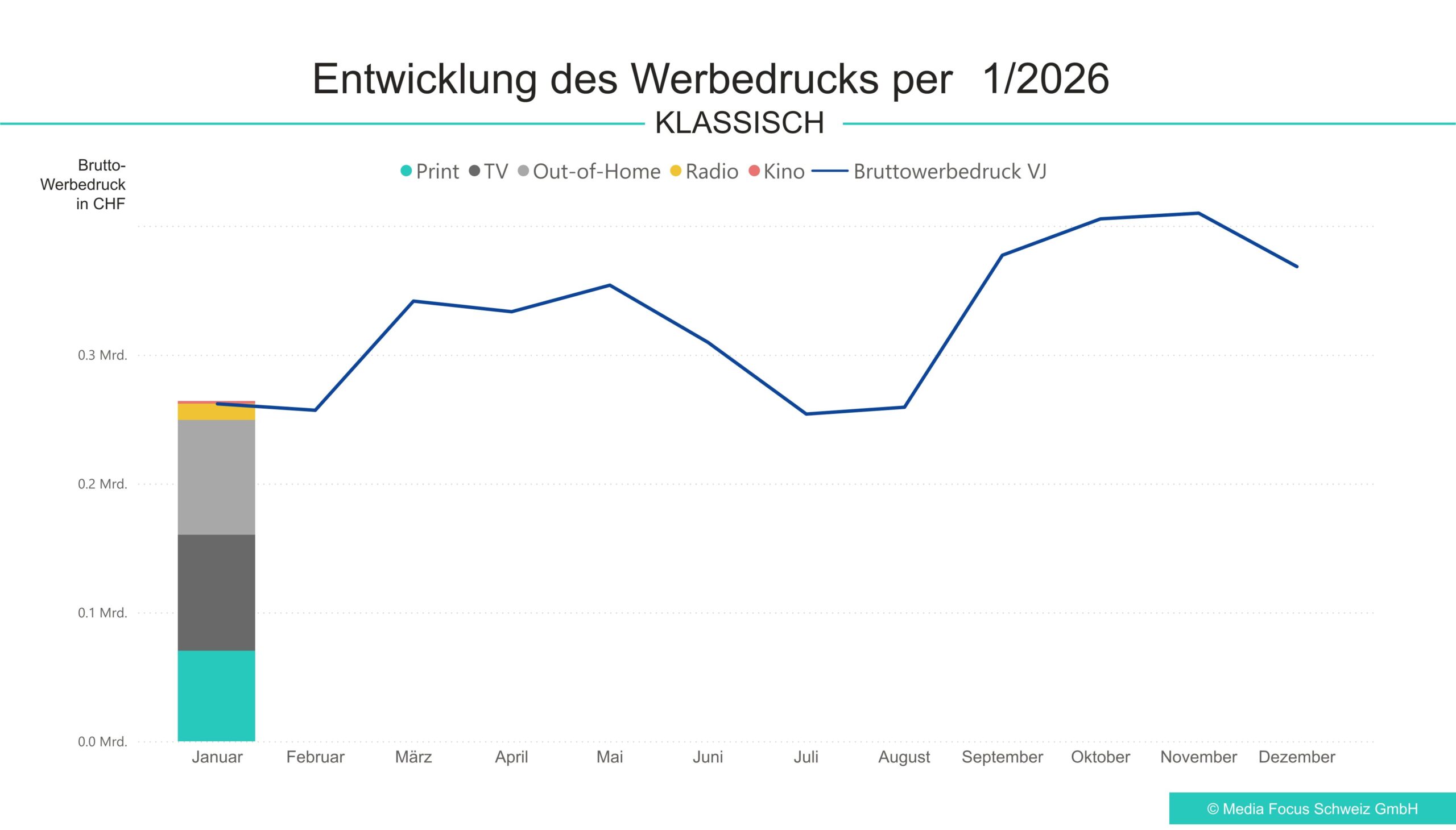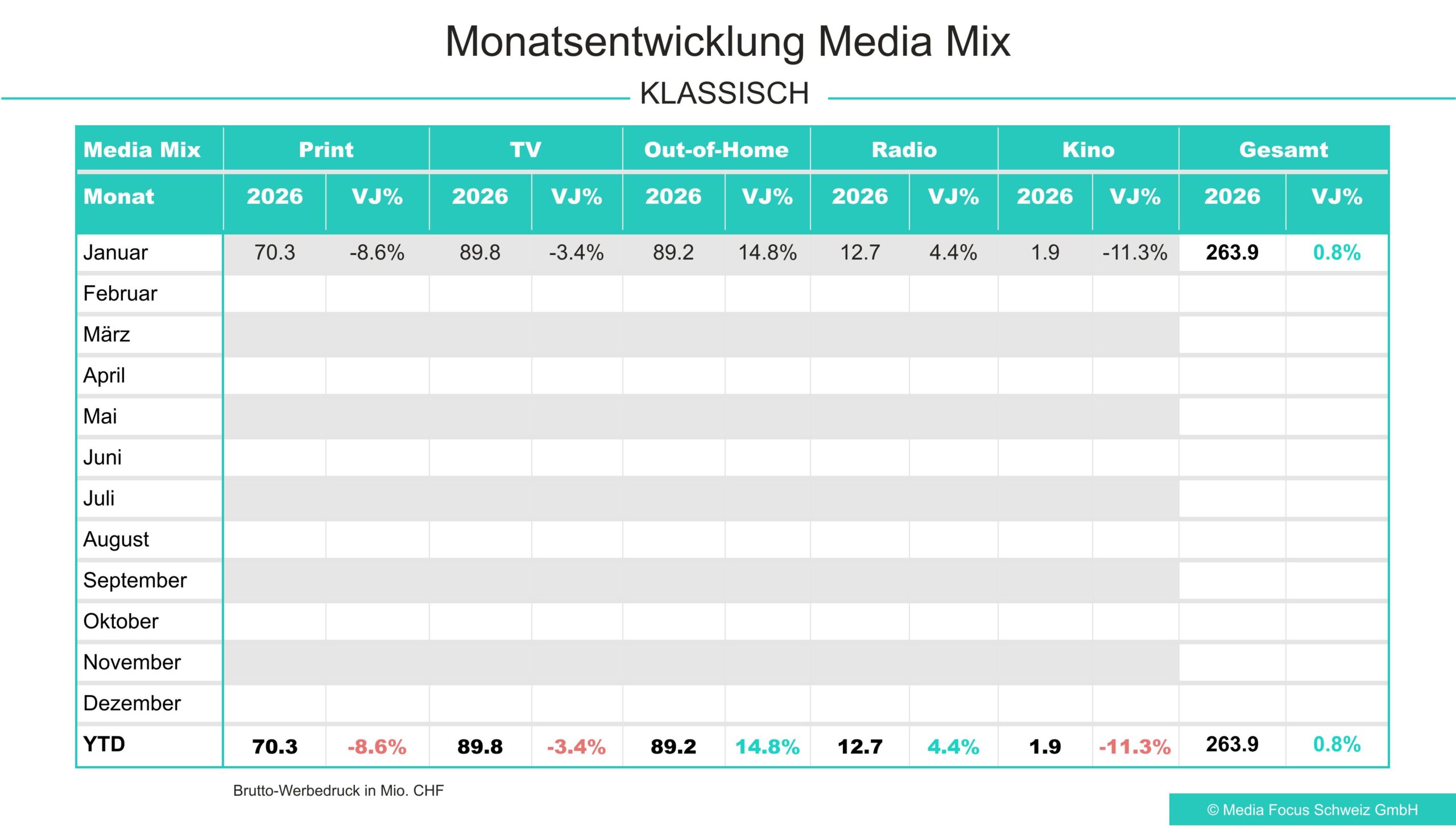 Der klassische Werbemarkt startet im Januar 2026 mit 263.9 Mio. CHF Brutto-Werbedruck und einem leichten Plus von 0.8% gegenüber Vorjahr. Der Zuwachs wird primär durch Out-of-Home getragen (+14.8%). Mit einem Anteil von 33.8% liegt Out-of-Home nur noch 0.2 Prozentpunkte hinter TV (34.0%), das im Januar -3.4% unter Vorjahr liegt. Radio entwickelt sich ebenfalls positiv (+4.4%). Rückgänge zeigen sich bei Print (-8.6%) und Kino (-11.3%).