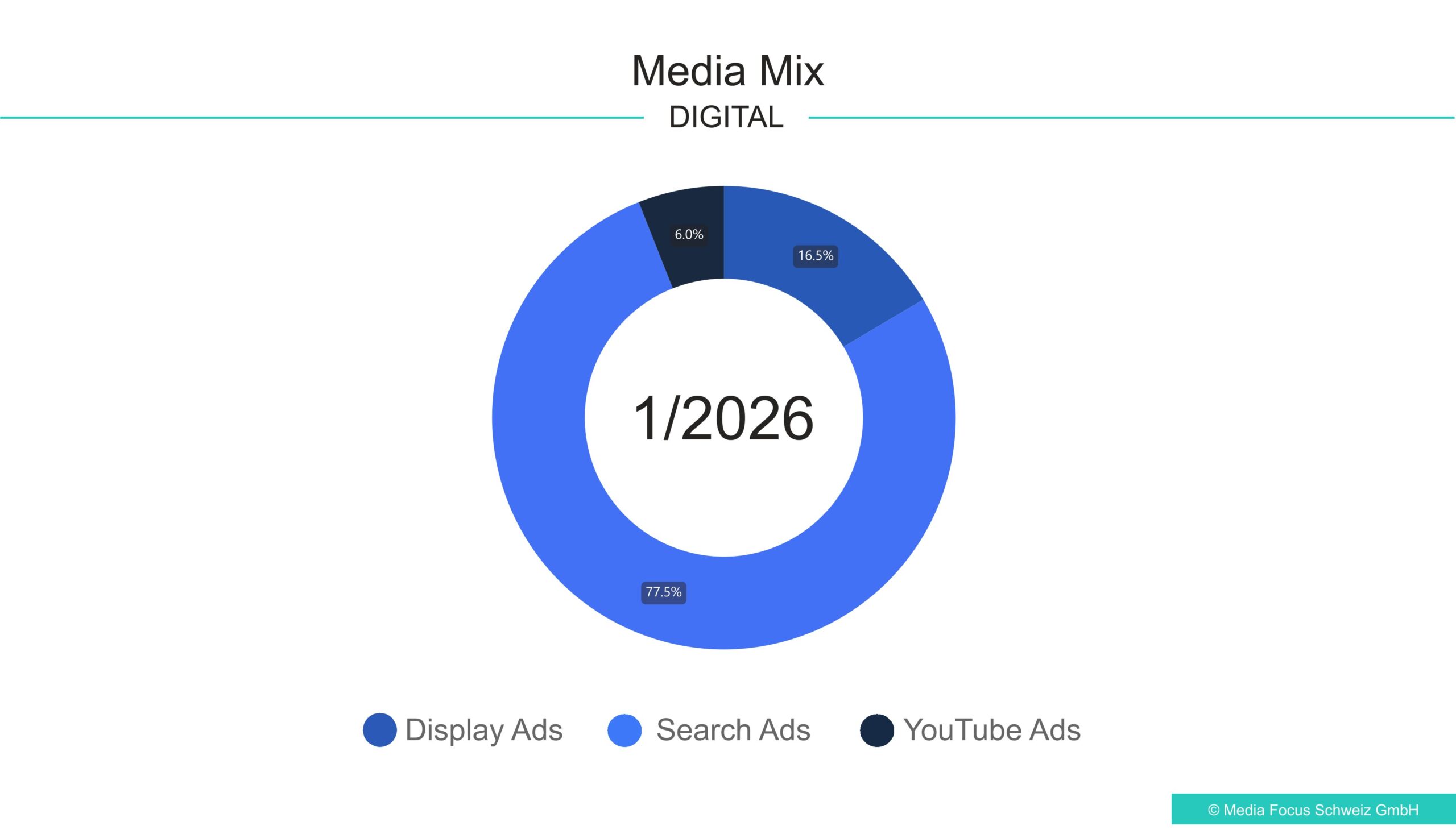 Der digitale Media-Mix bleibt dabei klar kanalgetrieben: Search dominiert mit 77.5%, gefolgt von Display (16.5%) und YouTube (6.0%).