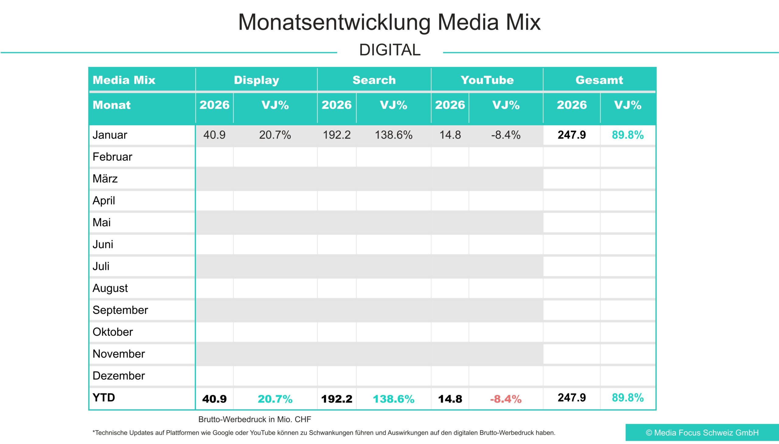Der starke Anstieg im Vergleich zum Vorjahr (+89.8%) ist v.a. durch Search getrieben (+138.6%) und nicht organisch, da technische Anpassungen von Google 2025 im ersten Quartal zu Einschränkungen in der Erfassung geführt hatten. Dadurch ist die Vergleichbarkeit mit dem Vorjahr punktuell eingeschränkt. Aber auch die Display-Lieferstatistik trägt im Januar 2026 zum Anstieg bei (+20.7%). YouTube ist leicht rückläufig (-8.4%).