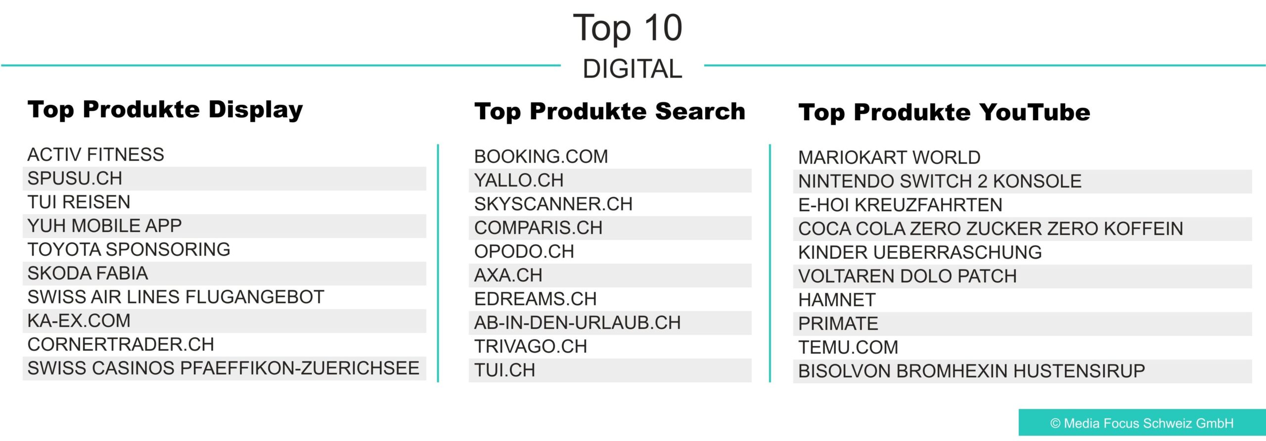 Im Display-Bereich liegt ACTIV FITNESS an der Spitze, gefolgt von SPUSU.CH und TUI REISEN. Dahinter reiht sich ein vielseitiges Feld ein: mit der YUH Mobile App, Toyota Sponsoring, dem Modell Skoda Fabia, einem Swiss International Air Lines Flugangebot, ka-ex.com, Cornertrader sowie Swiss Casinos Pfäffikon-Zürichsee.